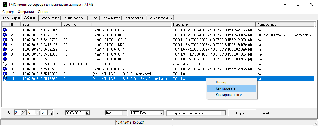 Вкладка «События» позволяет просматривать файл журнала событий клиента в программе «ТМС-монитор». При помощи панели инструментов можно задать интересующий временной интервал, за который необходимо отобразить событий а так же произвести сортировку отображенных событий. При нажатии ПКМ на область журнала в контекстном мню доступна возможность выбора инструмента «Фильтр». В версии 2.2 от 23.08.2017 г. и выше реализована функция квитирования из вкладки «События», квитировать можно как все отображенные так и единичные события.