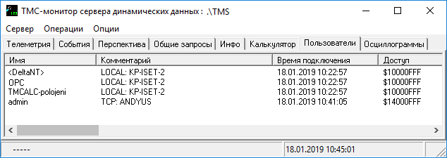 Демонстрирует список всех пользователей, подключенных к серверу динамических данных. Отображаются как реальные пользователи, так и работающие внешние задачи и дорасчеты.
