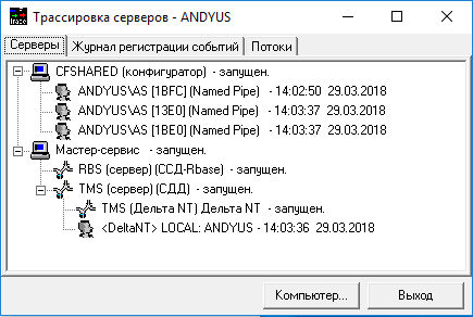 Для перехода в окно «Трассировка серверов» необходимо в окне главного меню программы «Настройка серверов» ЛКМ выбрать пункты меню «Компьютер» → «Трассировка обмена» или ЛКМ нажать на кнопку «Трассировка».