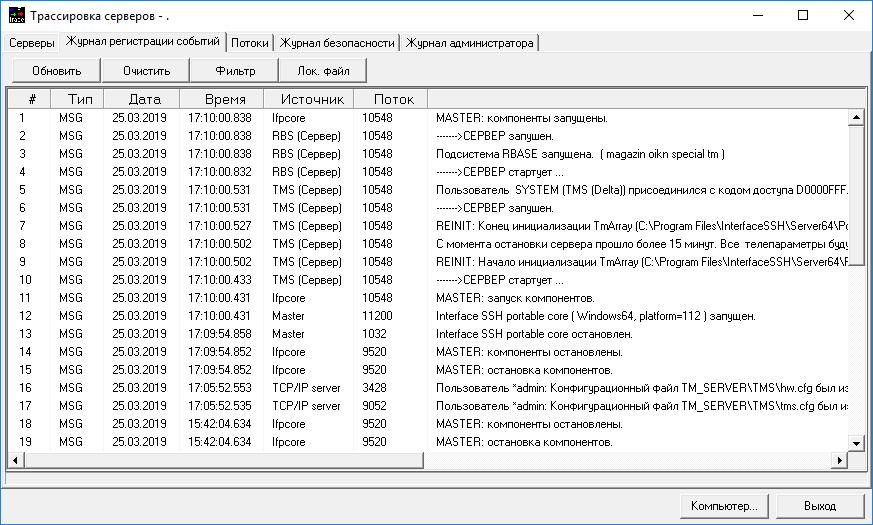 Выбор пунктов меню «Компьютер» → «Журнал событий» или нажатие ЛКМ на кнопку «Журнал» активирует окно главного меню программы «Трассировка серверов» на закладке «Журнал регистрации событий» (см. Рис. 18.2).