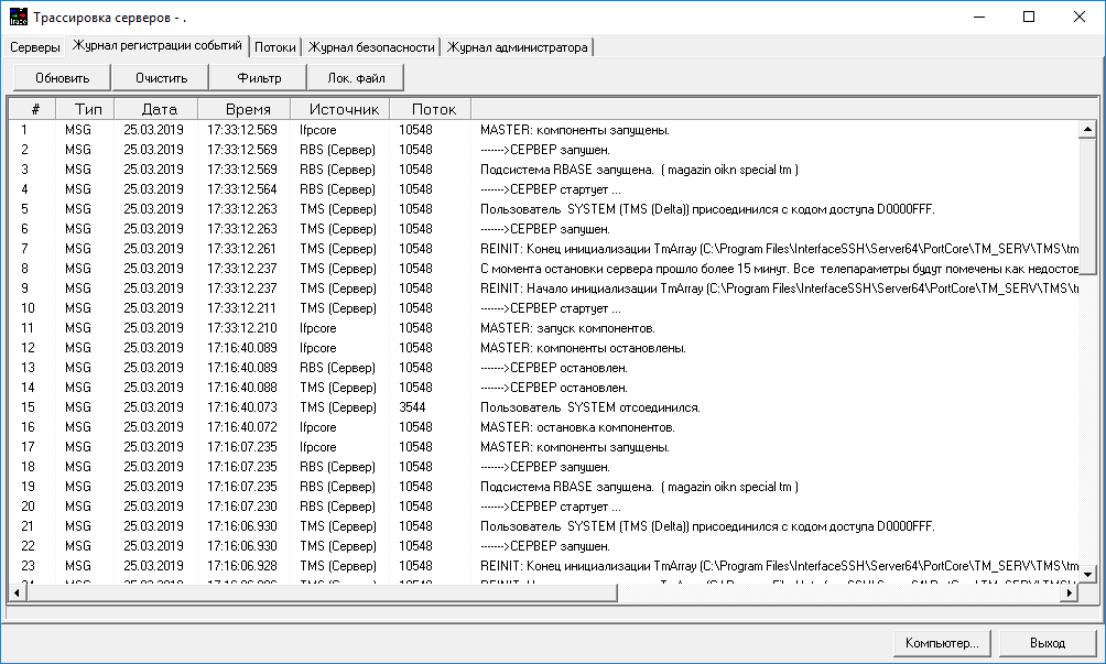 Выбор пункта меню «Журнал событий» активирует окно трассировки серверов на закладке «Журнал регистрации событий» (см. на Рис. 12.2). В версии 3.Х. для просмотра так же доступны вкладки «Журнал безопасности» и «Журнал администратора», ознакомиться с подробной информации о данных журналах можно в разделе 7.5.8. При просмотре журнала можно воспользоваться фильтром отбора событий. Окно настройки параметров фильтра отбора записей приведено на Рис. 12.3.