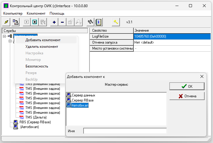 Для настройки необходимо добавить на уровне Master-сервиса компонент "Автобэкап"