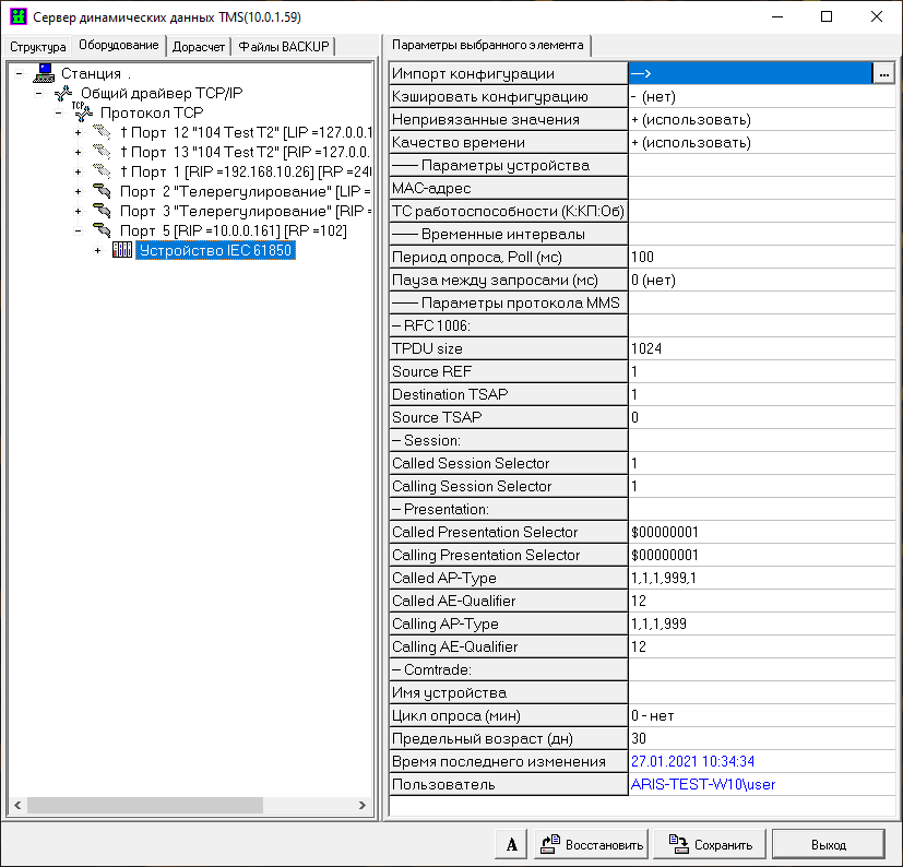 Для настройки информационного обмена первостепенно на уровне ПО сервера «ОИК Диспетчер НТ» необходимо сконфигурировать соединение с устройством через порт клиентского типа под общим драйвером TCP/IP - протокол TCP. Стандартный номер порта TCP для MMS-протокола 102.