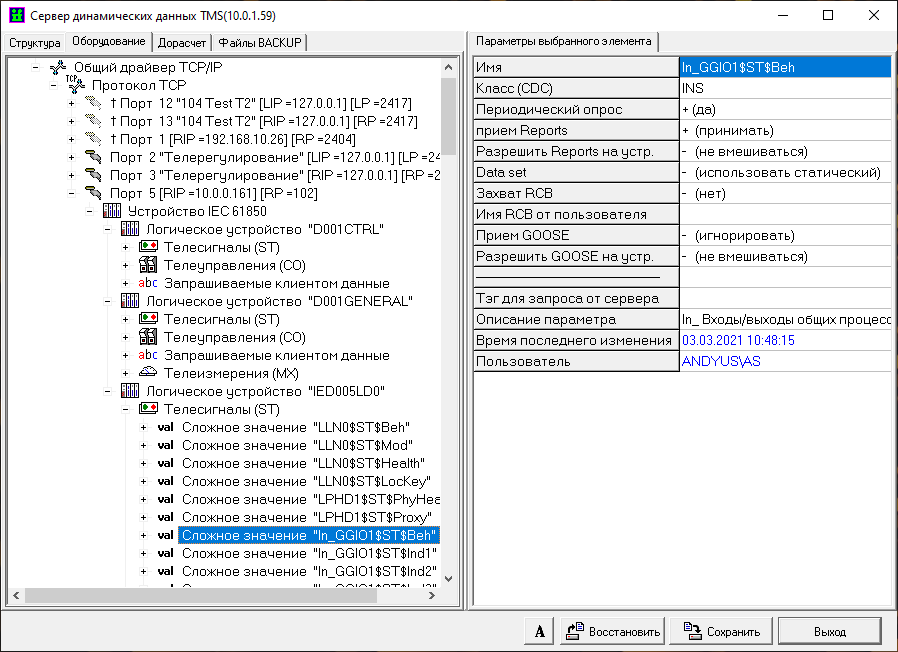 На уровне параметра сложного значений устанавливается соответствие принятого от устройства значения к структуре базы данных ПО сервера, которые выводятся на оперативную схему и журналы событий диспетчера.