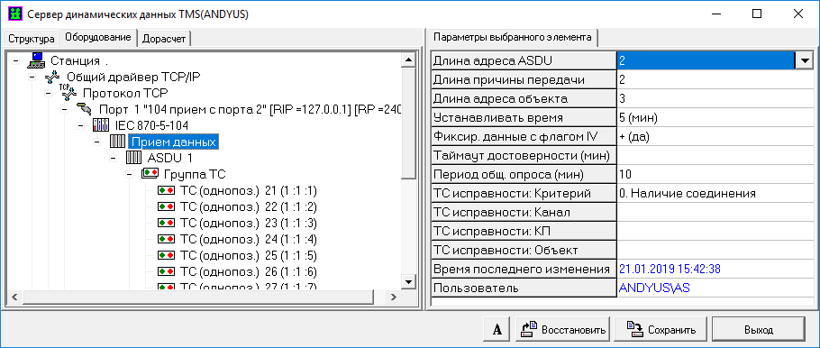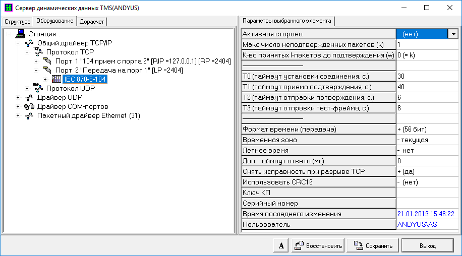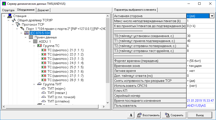 Настройка сервера TMS (прием ‘от себя’, МЭК 870-5-104, см. раздел 18.3.1)