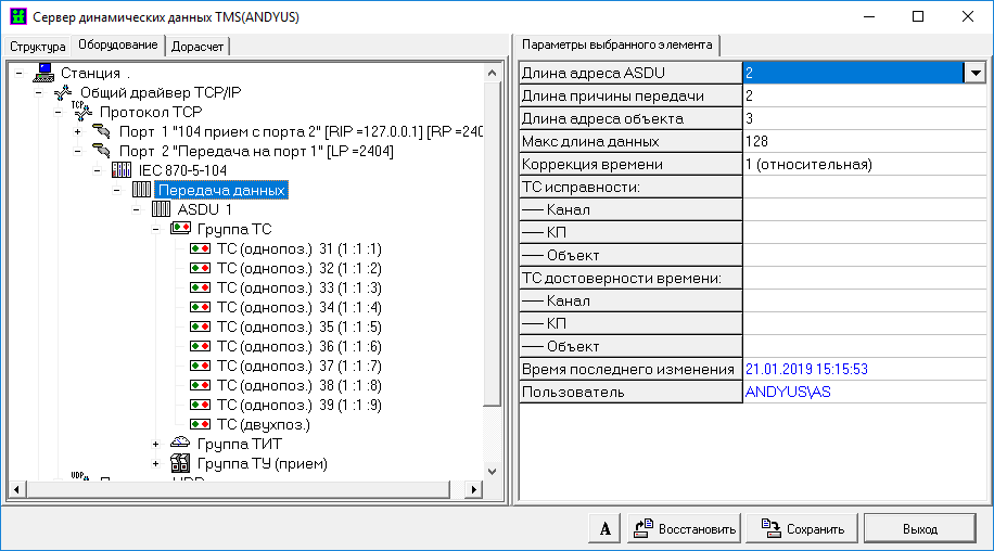 Настройка сервера TMS (передача ‘на себя’, МЭК 870-5-104, см. раздел 18.3.2)