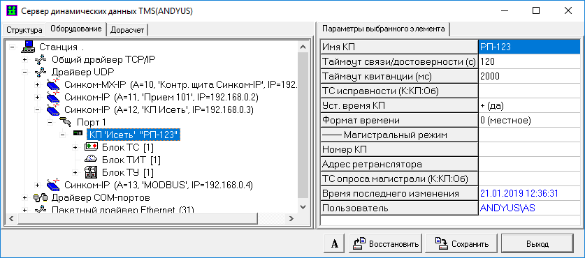 Настройка сервера TMS (протокол КП «Исеть (UDP)», см. раздел 10.2.3)