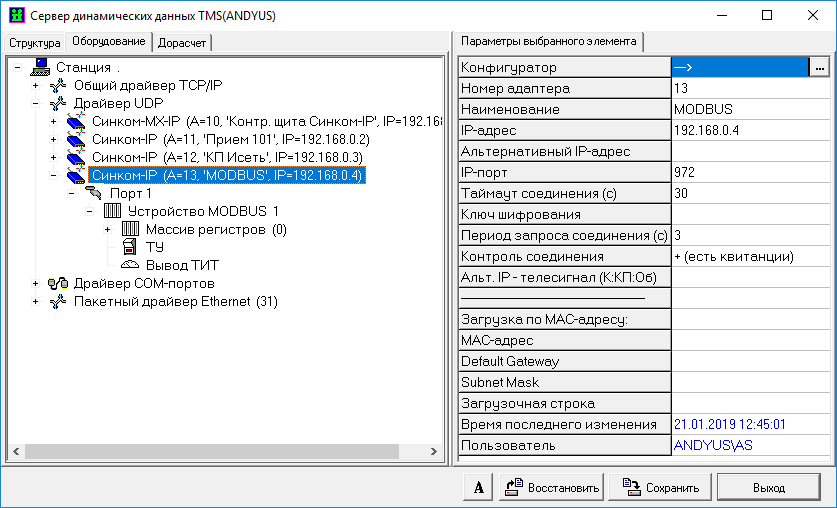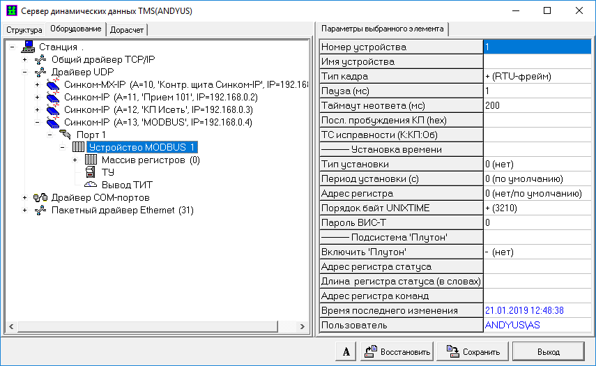 На рисунках приведен пример настроек сервера динамических данных (под именем TMS) при приеме телеметрии от УТМ в протоколе «MODBUS» через контроллер Синком-IP, подключенный к серверу по локальной сети Ethernet.