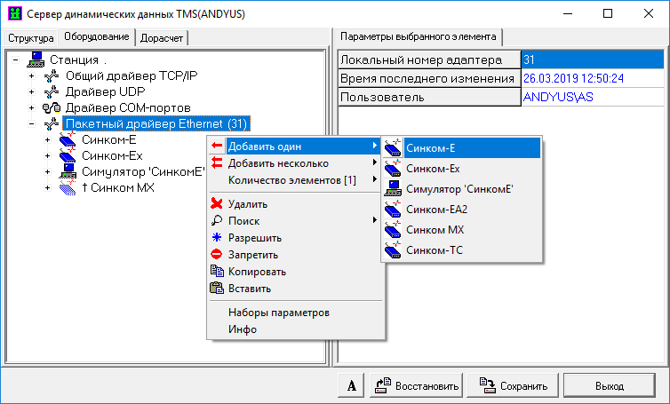Пакетный драйвер Ethernet может использоваться для передачи информации с имитацией некоторых протоколов УТМ (компонент настройки – симулятор ‘Синком-Е’).