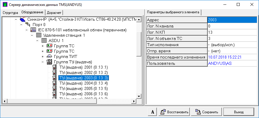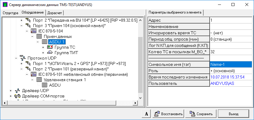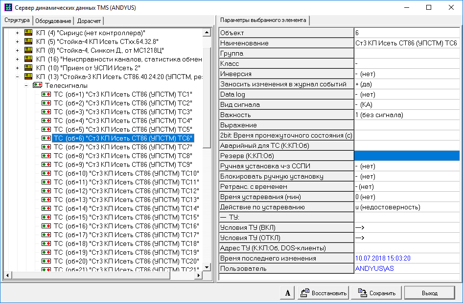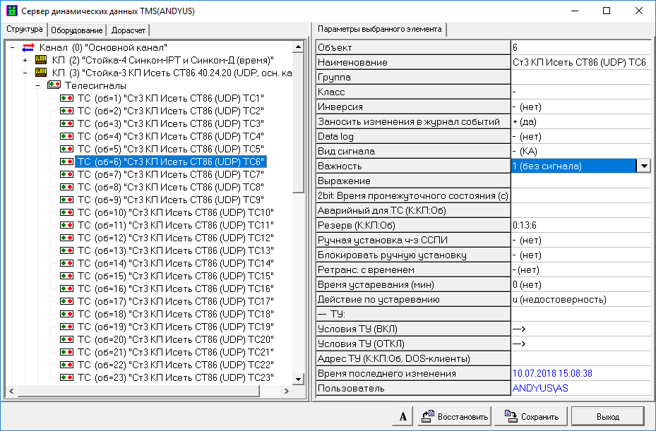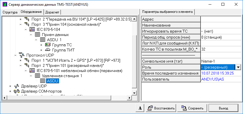 При приеме телеметрии по резервированным каналам связи следует учитывать некоторые особенности описания ТС и ТИТ в разделе «Структура» и описания ТУ в разделе «Оборудование» сервера динамических данных.