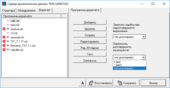 Комплекс поддерживает независимые программы дорасчета. Каждая из программ хранится в отдельном файле. Порядок описания программ дорасчета безразличен – все они имеют один уровень приоритета. Вновь создаваемые программы записываются в файл с использованием кодировки ANSI (формат Windows).