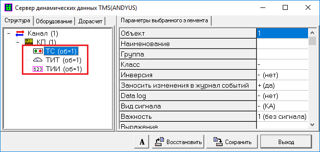 Для перехода в окно настройки структуры сервера динамических данных необходимо в окне главного меню программы «Настройка серверов» ЛКМ выбрать строку сервера динамических данных (по умолчанию - «TMS (Сетевой сервер)») и ЛКМ нажать на кнопку