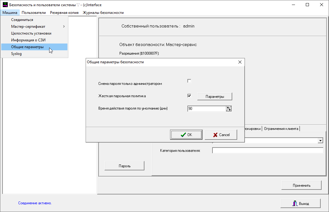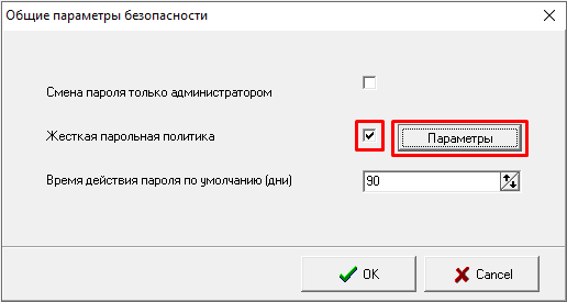 Для выбора парольной политики в ПО настройки безопасности необходимо выбрать пункт меню «Машина» - «Общие параметры», в появившемся окне установить галочку напротив раздела "Жесткая парольная политика". После установки галочки доступна возможность дополнительно настроить параметры жесткой парольной политики для этого нужно нажать на появившеюся кнопку "Параметры".