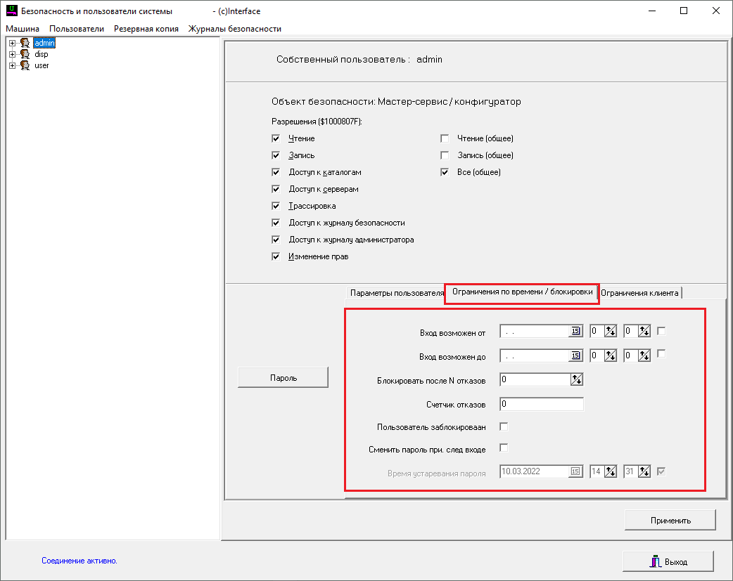 Строки "Вход возможен от", "Вход возможен до" можно указать конкретные даты и время допуска пользователя;