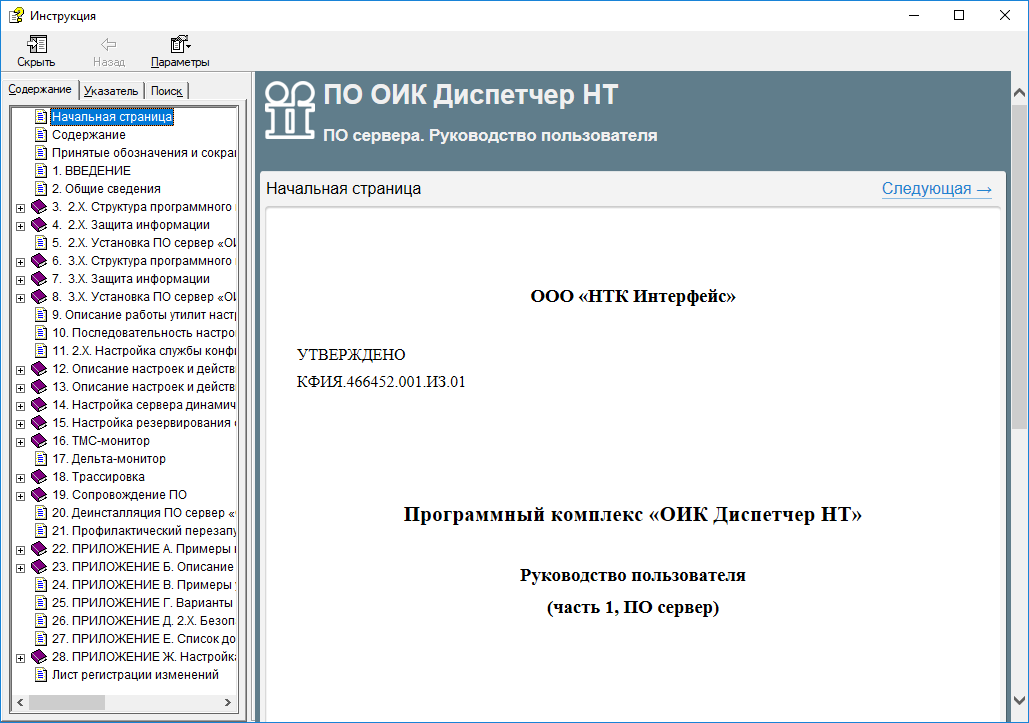 Выбор пунктов меню «Помощь» -> «Readme» активирует окно просмотра журнала изменений программного обеспечения сервера «ОИК Диспетчер НТ» в хронологическом порядке. Выбор пунктов меню «Помощь» -> «Помощь» позволяет осуществить для Off-line - просмотр данного документа.