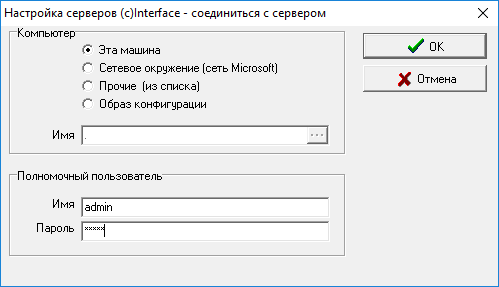 В появившемся окне, необходимо определить к какому серверу будет производиться подключение. Если контрольный центр и ПО сервера «ОИК Диспетчер НТ» установлены на одном компьютере, то автоматически выбраны следующие параметры подключения: «Эта машина», в поле имя указан символ «.»(точка)