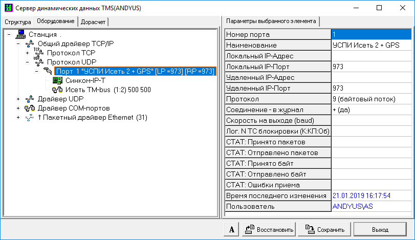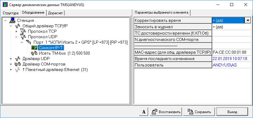 На рисунках приведен пример настроек сервера динамических данных, подключенного через сетевой коммутатор к шине «Исеть TM-BUS» УСПИ «Исеть 2». Коррекция времени сервера по сигналам GLONASS/GPS настроена на прием ‘широковещательных’ посылок точного времени от одного из контроллеров УСПИ.