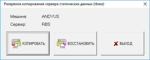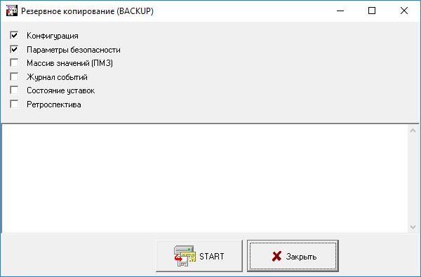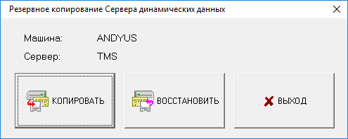 Для создания резервной копии сервера динамических данных следует в окне главного меню программы «Настройка серверов» (см. раздел 6) ЛКМ выбрать строку сервера динамических данных, нажатием ПКМ на поле панели «Службы» активировать контекстное меню, в котором ЛКМ выбрать пункт меню «BackUp». В открывшемся окне «Резервное копирование сервера динамических данных» ЛКМ нажать кнопку «Копировать». В открывшемся окне «Резервное копирование (BackUp)» выбрать компоненты для копирования и ЛКМ нажать кнопку «START». В открывшемся диалоге выбрать каталог для резервной копии. Будет создана резервная копия под именем: