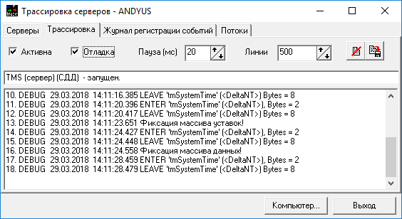 Окно «Трассировки серверов» ПО сервера «ОИК Диспетчер НТ» версии 3.Х.