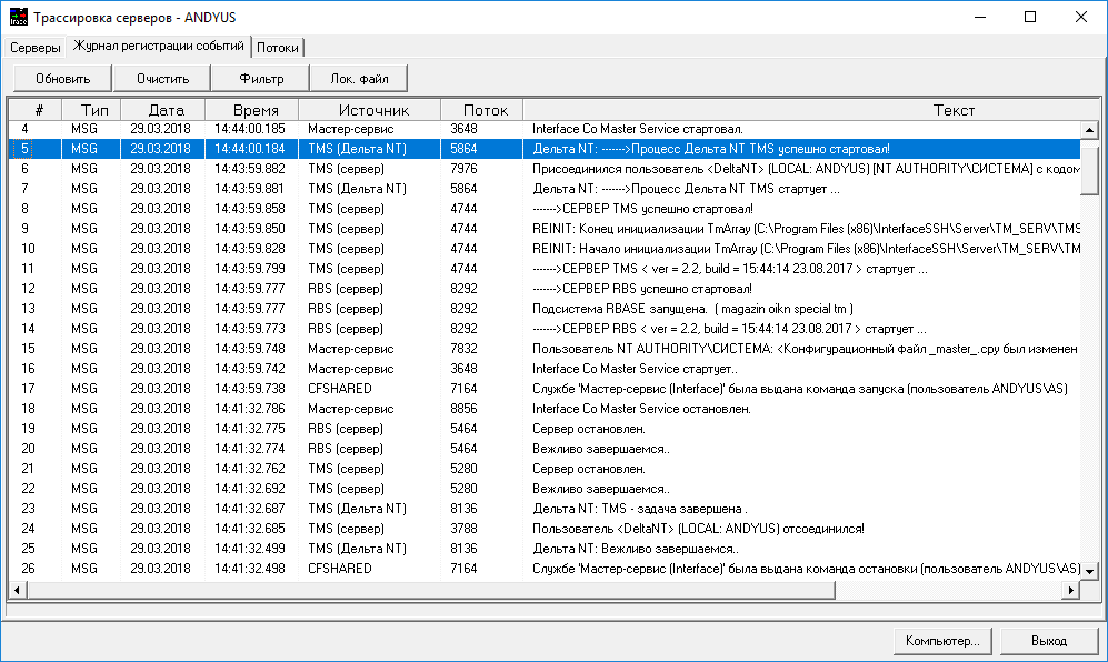 Программа «Трассировка серверов» («Журнал регистрации событий»)