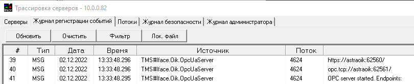 В журнале регистрации событий будет запись с реквизитами, по которым можно удаленно подключиться к службе OPC: