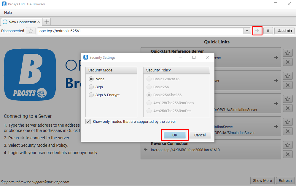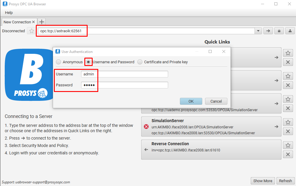 Используя OPC клиент (умеющий производить подключение по заданным логину и паролю) произвести подключение к базе по данным реквизитам (используя логин и пароль доступа к серверу ОИК).