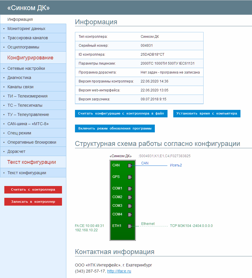 Стартовая страница содержит справочную информацию о контроллере, ссылки для перехода в режимы конфигурирования и обновления резидентного программного обеспечения.