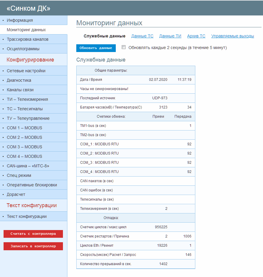 общие данные (текущие дата и время, температура процессора, напряжение резервной батареи, количество/причина рестартов контроллера, период времени между моментами синхронизации внутренних часов контроллера, источник синхронизации),