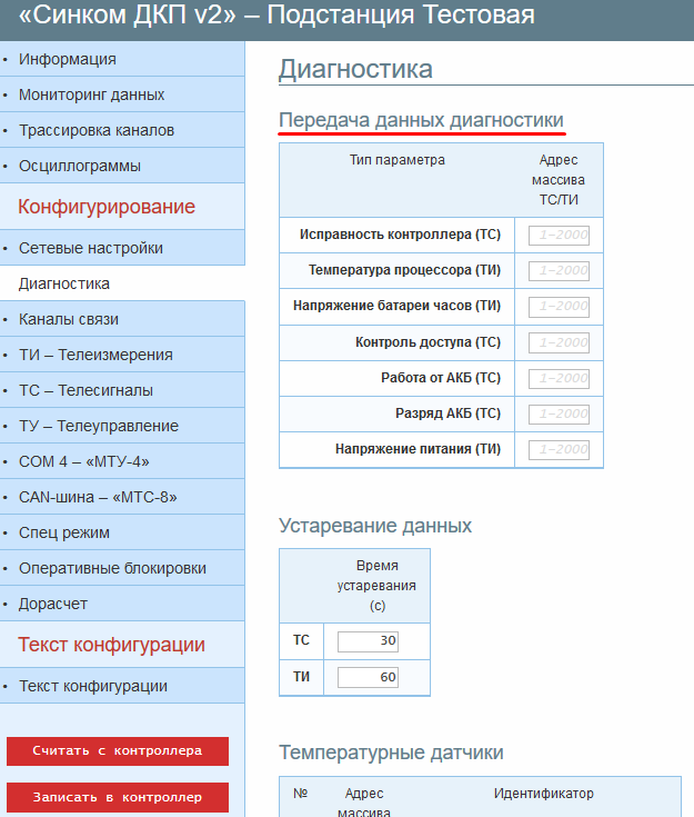 Все контроллеры серии «Синком-Д» позволяют настроить передачу на верхний уровень диагностических ТС и ТИ контроллера «Исправность контроллера», «Температура процессора» и «Напряжение батареи часов». Контроллеры «Синком-ДКП» и «Синком-ДКП»/13,8 также позволяют передавать ТС и ТИ «Контроль доступа», «Работа от АКБ», «Разряд АКБ» и «Напряжение питания».