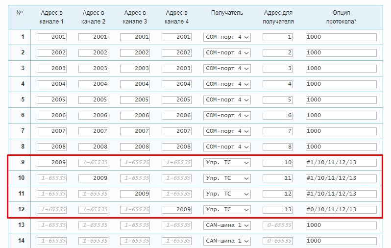 В параметре "Адрес для получателя" для каждого канала связи необходимо указать свободный ТС из общего массива телесигналов контроллера.