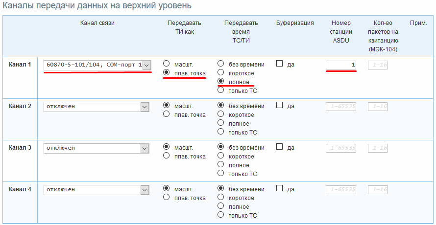 Пример: Канал связи 1 будет передавать данные на «верхний уровень» в протоколе МЭК 60870-5-101 через порт COM1. ТИ будут передаваться в формате числа с плавающей точке. Метки времени спорадических ТИ будут передаваться в полном формате. Номер станции и ASDU – 1. Архив спорадических ТС при установлении соединения передаваться не будет.