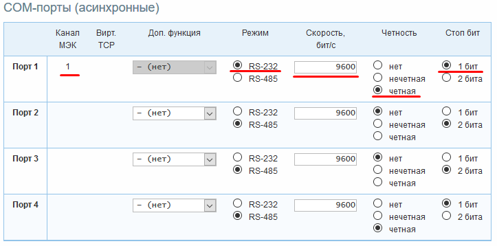Пример: Согласно примеру выше, порт COM1 используется для обмена с «верхним уровнем». Используемый интерфейс – RS-232. Скорость обмена 9600 бод. Контроль чётности с 1 стоп-битом.