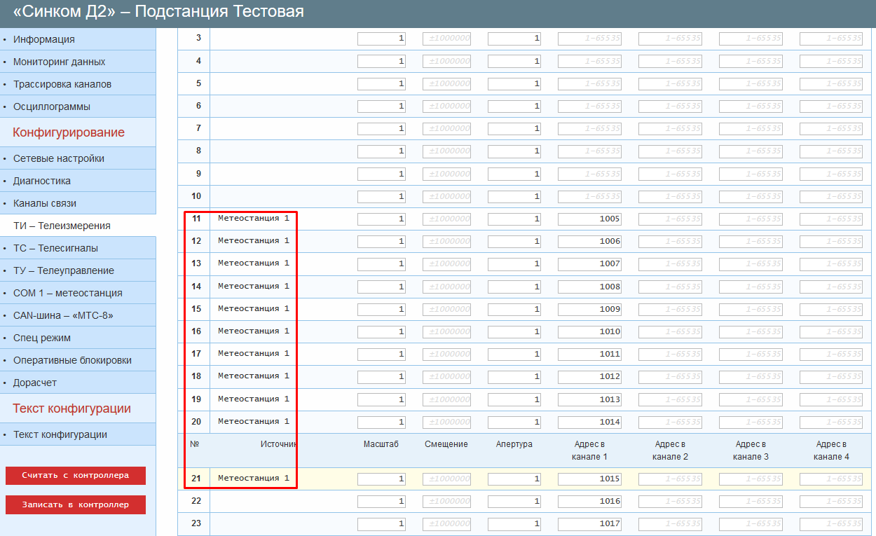 Пример: В соответствии с примером выше, ТИ №11-21 – ТИ считанные с метеостанции.