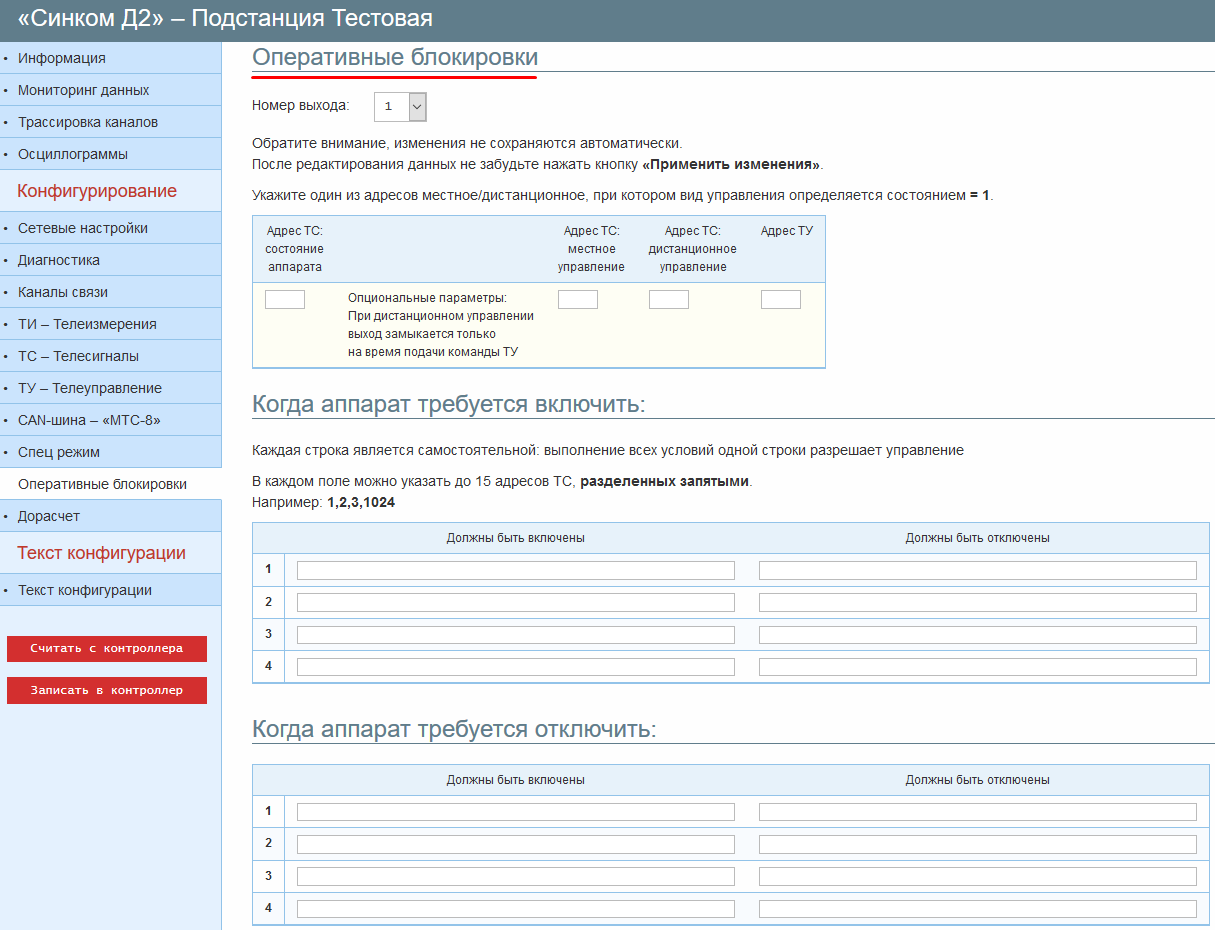 Внимание: Во вкладке "Оперативные блокировки" описываются выходы реле блокировочного модуля ТУ430Б. Выходы реле данного модуля предназначены для осуществления длительного по времени воздействия на замки электромагнитной блокировки, которые в свою очередь запрещают или разрешают переключение приводов коммутационных аппаратов. Адреса модулей ТУ430Б, используемые для блокировок, и адреса модулей ТУ430, используемые для телеуправления, не должны пересекаться в общем адресном пространстве CAN-шины.