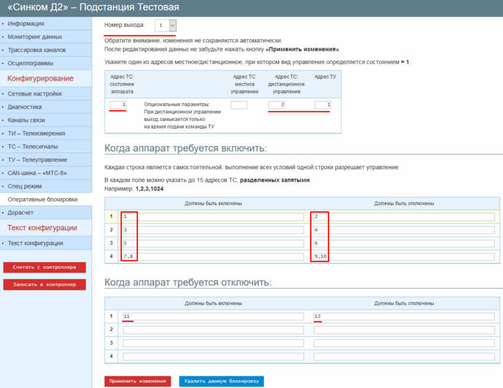 Пример: Настройка выполняется для 1 выхода первого блока «ТУ430Б». Адрес ТС состояния аппарата в массиве контроллера равен 1. Адрес ТУ, к которому применяется блокировка, равен 1.
