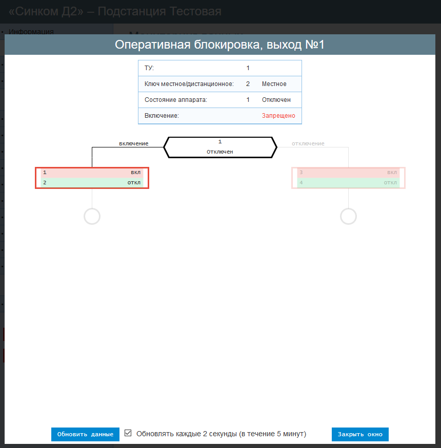 После завершения настройки, на вкладке «Мониторинг данных» в закладке «Управляемые выходы» можно посмотреть текущее состояние выходов оперативных блокировок.