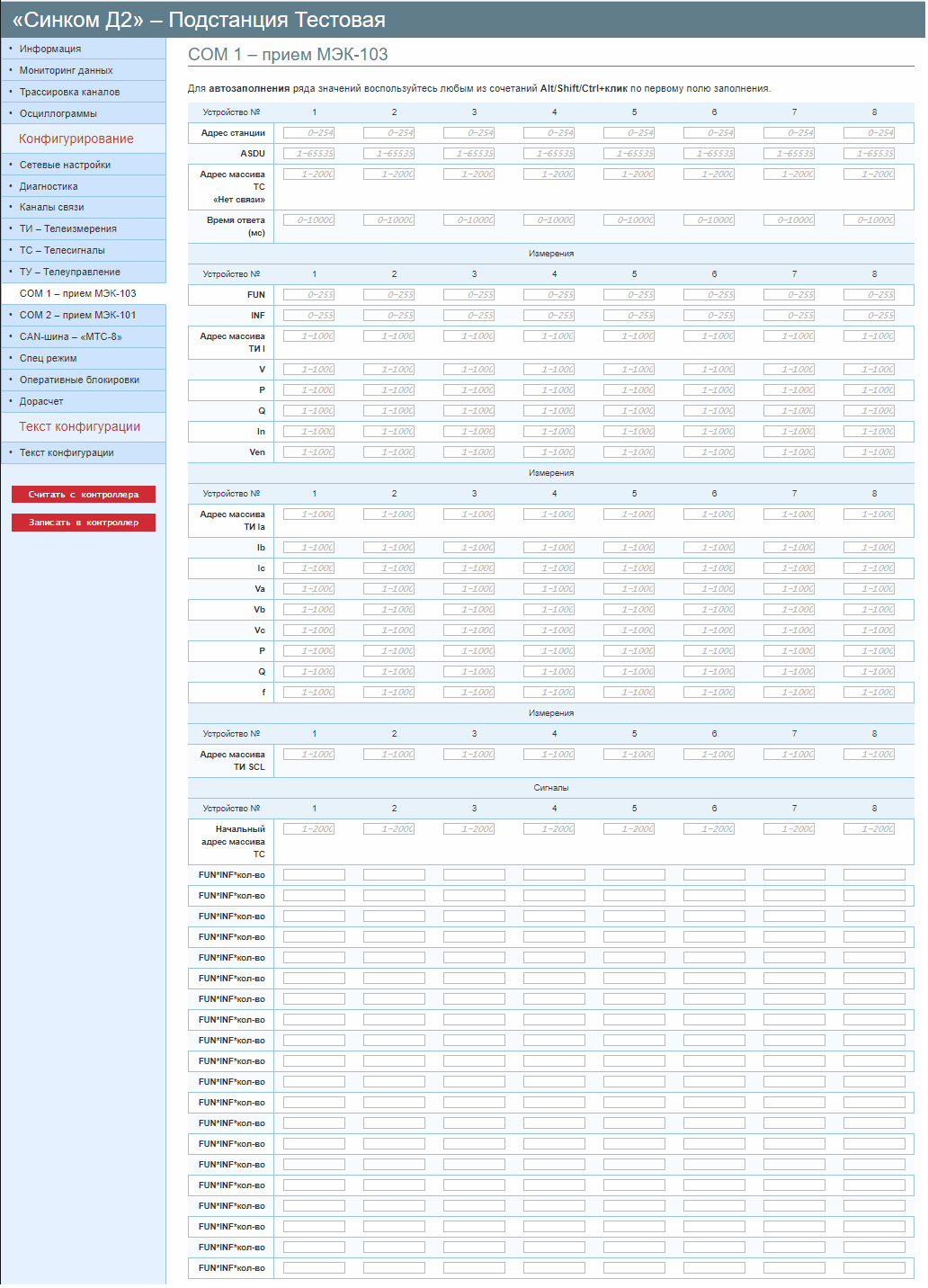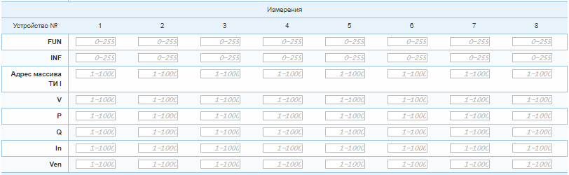 В протоколе МЭК 870-5-103 контроллер серии Синком-Д может принимать телеизмерения только информационными пакетами 3-х типов. Значение параметров FUN и INF имею значение только для второго типа, задаются в случае необходимости указания конкретного пакета данных. Информацию о значениях FUN и INF необходимо уточнить в документации на опрашиваемое устройство. Адреса для принимаемых телеизмерений в массиве ТИ контроллера задаются произвольно.