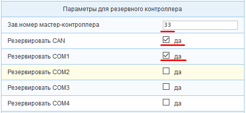 Пример: Настраиваемый в примере контроллер выступает в качестве резервного. В качестве основного выступает контроллер с заводским номером 33. Порты CAN и COM1 зарезервированы.