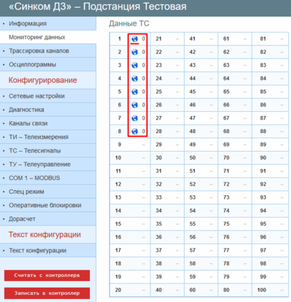 Пример: Контроллер «Синком-Д2» получает 8 ТС от модуля серии «МТС-8», которые записываются в массив ТС контроллера по адресам с 1 до 8. Контроллер «Синком-Д3» соединён с контроллером «Синком-Д2» шиной «Исеть TM-BUS». Так как контроллеры находятся в едином адресном пространстве, ТС полученные в контроллером «Синком-Д2» также отражаются в массиве контроллера «Синком-Д3». Специальный знак рядом со значением ТС во вкладке «Мониторинг данных» отражает что ТС получены по шине «Исеть TM-BUS».