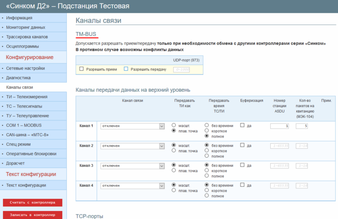 Настройки шины «Исеть TM-BUS» контроллера «Синком-Д2»