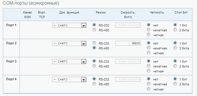 COM порт 1 используется для подключения наладочного пробника, COM порт 2 для подключения оборудования щита по RS-485. Скорость по RS-485 выставляется равной 9600 бит/с.