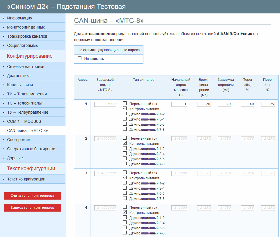 Адреса в канале 1 устанавливаются автоматически в соответствии с адресом в массиве ТС контроллера. По необходимости они могут быть изменены.