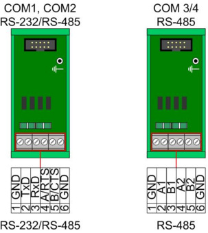 Для подключения внешних цепей к COM-портам контроллера рекомендуется использовать клеммник COM-порта контроллера «Синком-ДК». Клеммник подключается к контроллеру с помощью десятижильного кабеля с разъёмами IDC-10 – IDC-10 (1 к 1). Для подключения внешних цепей используется винтовые клеммы для кабелей сечением до 2.5мм2.