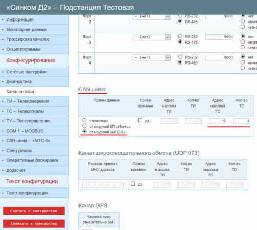 В разделе «CAN-шина» установить параметр «Приём данных» в положение «от модулей КП "Исеть"» для модулей младше версии 5, и «от модулей "МТС-8"» для модулей версии 5 и старше.