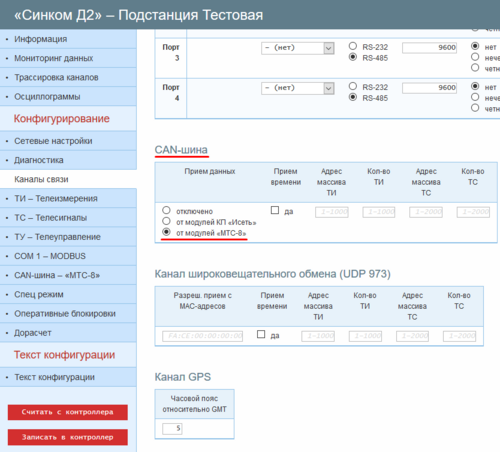 В разделе «CAN-шина» установить параметр «Приём данных» в положение «от модулей "МТС-8"».