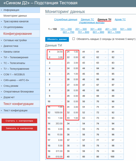 Чтобы проверить конфигурацию ТИ необходимо открыть раздел «Данные ТИ» и удостовериться что контроллер принимает ТИ согласно конфигурации.