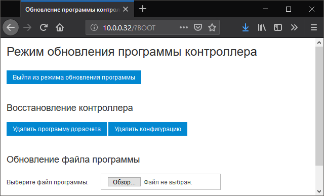 Пример: Заходим в режим восстановления контроллера с IP-адресом «10.0.0.32» добавив параметр «?BOOT». Строка HTTP-адреса равна «10.0.0.32/?BOOT».