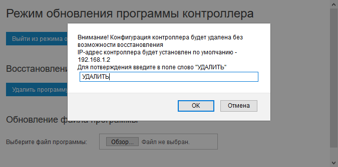После завершения сброса конфигурации контроллер перезагрузится с заводскими настройками и будет доступен по IP-адресу «192.168.1.2».