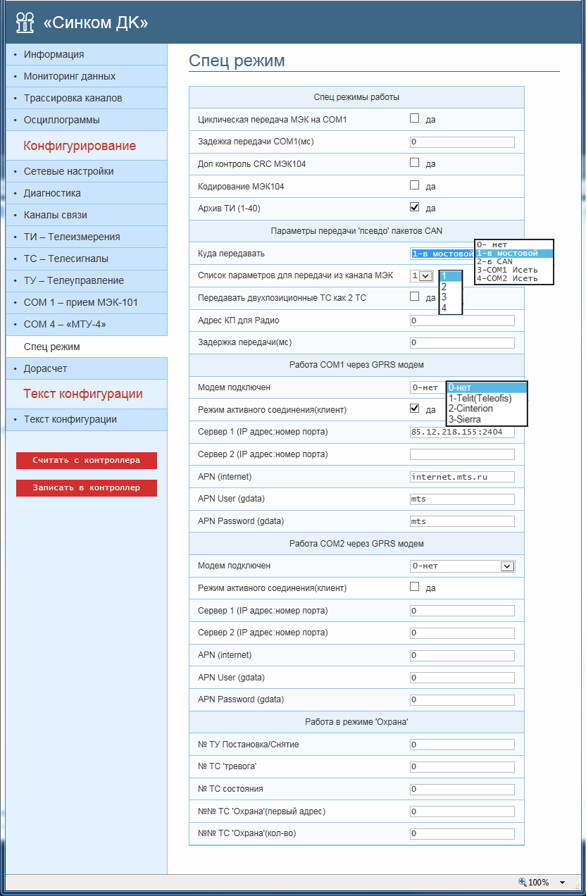 Окно настройки «Спец режим» служит для настройки специальных режимов использования асинхронных портов СОМ1, СОМ2 и CAN-порта контроллера.