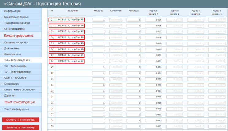 После настройки, ТИ каждого из запросов будут отражены во вкладке «ТИ – Телеизмерения» в соответствии с количеством считываемых регистров и значениями параметров «Начальный адрес в массиве ТС/ТИ».